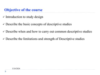 The document discusses epidemiological study designs, focusing on descriptive and analytical studies, their purposes, strengths, and limitations. It describes how descriptive studies characterize disease occurrence by person, time, and place and serve to generate hypotheses for further analytical studies. Various types of descriptive studies including case reports, case series, cross-sectional studies, and correlational studies are outlined with their specific methodologies and applications in research.