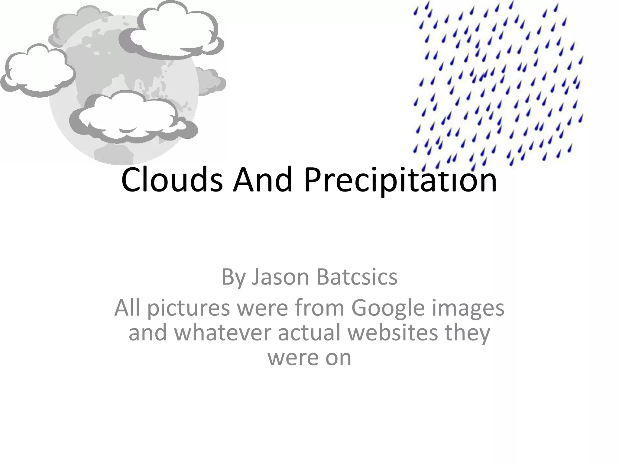 This document discusses various types of clouds and precipitation. It explains processes like adiabatic temperature changes, orographic and frontal lifting that cause clouds to form. The document categorizes clouds by height as high, middle and low clouds. It also discusses different types of precipitation like rain, snow, sleet and hail. The key roles of condensation and freezing in the formation of clouds and precipitation are outlined.