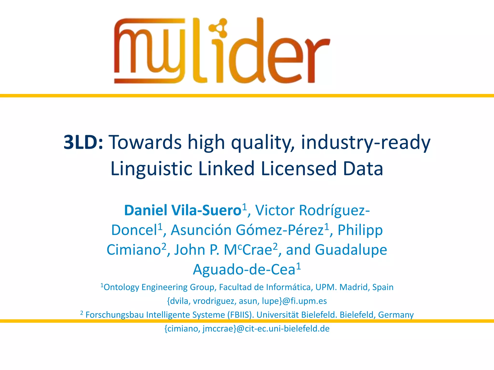 The document discusses the concept of '3LD' (Linguistic Linked Licensed Data) which focuses on licensing language resources as linked data using standard data models. It emphasizes the importance of metadata and rights declarations in order to facilitate open access and promote the re-use of linguistic data. A demonstration of a conditional access linked data prototype is provided, showcasing its application for managing access to geographical data in Spain.