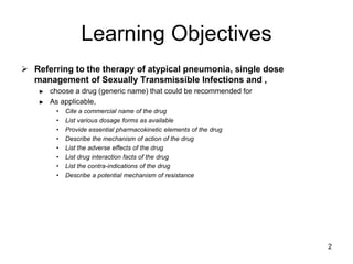This document discusses macrolide antibiotics, including erythromycin, clarithromycin, azithromycin, and telithromycin. It describes their mechanisms of action as protein synthesis inhibitors that bind reversibly to the 50S ribosomal subunit. It outlines their spectra of activity against various gram-positive and -negative bacteria as well as atypical pathogens. It also covers their pharmacokinetics, clinical uses, adverse effects, drug interactions, and mechanisms of resistance.