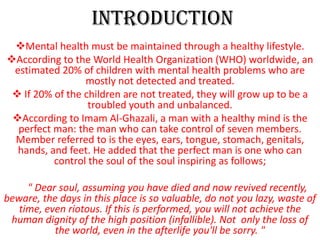 According to the World Health Organization, an estimated 20% of children suffer from undetected and untreated mental health problems. If left untreated, these children are at risk of becoming troubled youth and developing unbalanced lives. Imam Al-Ghazali believed that a person with a healthy mind can control their eyes, ears, tongue, stomach, genitals, hands, and feet. He advised that people should make the most of their valuable time on earth and avoid wasting time or engaging in sinful activities, in order to achieve human dignity and avoid regret in the afterlife. The document recommends solving mental health problems among children through counseling, religious education, and public awareness campaigns.