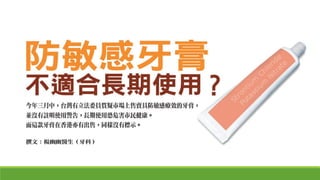 文档讨论了防敏感牙膏的使用及潜在风险,强调该产品不适合长期使用,并提到了台湾立法委员对市场上缺乏使用警告的牙膏表示担忧。还提供了关于牙科教育的相关信息,涉及多种口腔健康主题及注意事项,旨在提升公众对牙科健康的认识。整体内容致力于提供权威、易懂的口腔卫生教育资讯。