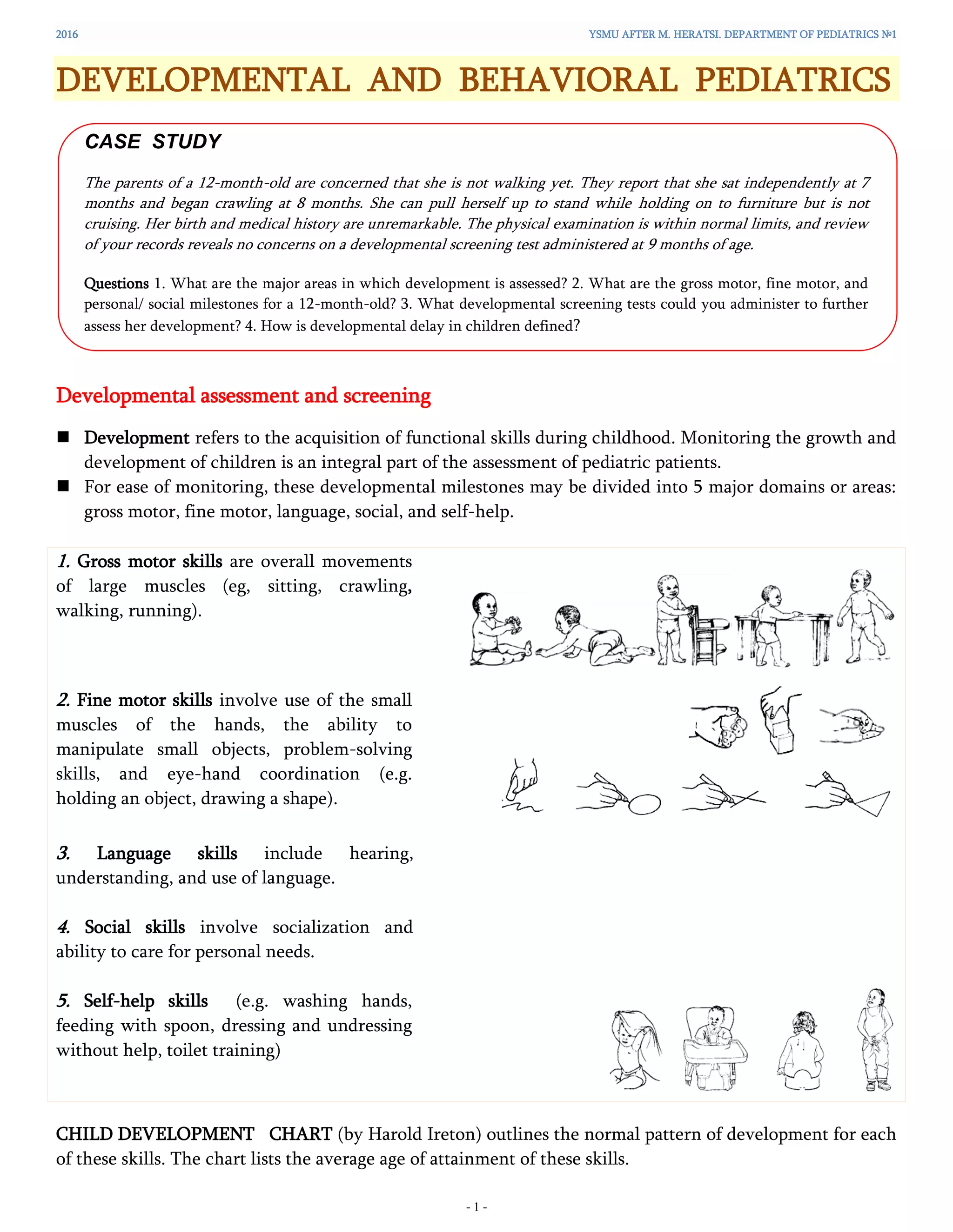 A 12-month-old girl is not yet walking, which concerns her parents. She can pull herself up and stand while holding furniture but does not cruise. Her development was previously assessed as normal. Development is assessed across five domains: gross motor, fine motor, language, social, and self-help skills. Milestones for a 12-month-old include walking, pincer grasp, and social skills like joint attention. Screening tests could further assess her development. Developmental delay is defined as skills significantly below what is expected for age.