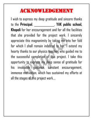 This document is a physics project file on polarisation. It begins with an acknowledgement and certificate sections. The contents section outlines that it will discuss the introduction to polarisation, four types of polarisation (transmission, reflection, refraction, and scattering), and applications. The body of the document then defines unpolarised light and polarisation. It describes the four types of polarisation in detail and provides examples. It concludes with discussions of applications of polarisation in stress analysis, 3D movies, and reducing glare. The bibliography cites physics textbooks and online sources used.