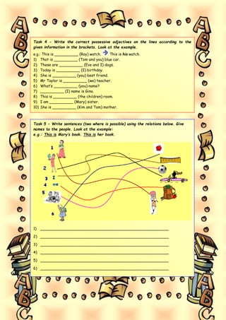 The document consists of exercises to practice possessive adjectives with the verb 'to be.' It includes tasks such as filling in charts, identifying correct answers, rewriting sentences using possessive adjectives, and creating sentences based on given relationships. The exercises are designed to enhance understanding and usage of possessive forms in various contexts.