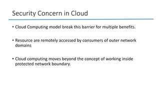 The document discusses security considerations for cloud computing. It summarizes cloud security working groups that were formed to address security issues and categorize issues. It then discusses elements of a cloud security model including privileged user access, regulatory compliance, data location, data segregation, recovery, investigation support, and long-term viability. Finally, it introduces the Cloud Security Reference Model and the Cloud Cube Model for standardizing secure cloud computing and addressing de-perimeterization of networks.