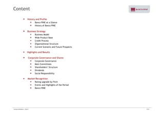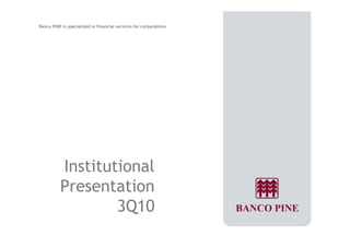 Banco PINE is a specialized Brazilian bank focused on providing financial services to corporations. It has a diverse range of credit, funding, treasury, and investment products. In the third quarter of 2010, Banco PINE saw improvements across key indicators such as a 9.8% increase in corporate loans, 10.2% growth in total funding, 20.7% rise in operating income, and 5.6% increase in net income, demonstrating consistent earnings growth. The document provides an overview of Banco PINE's history, business lines, organizational structure, capitalization, and financial highlights for the third quarter.