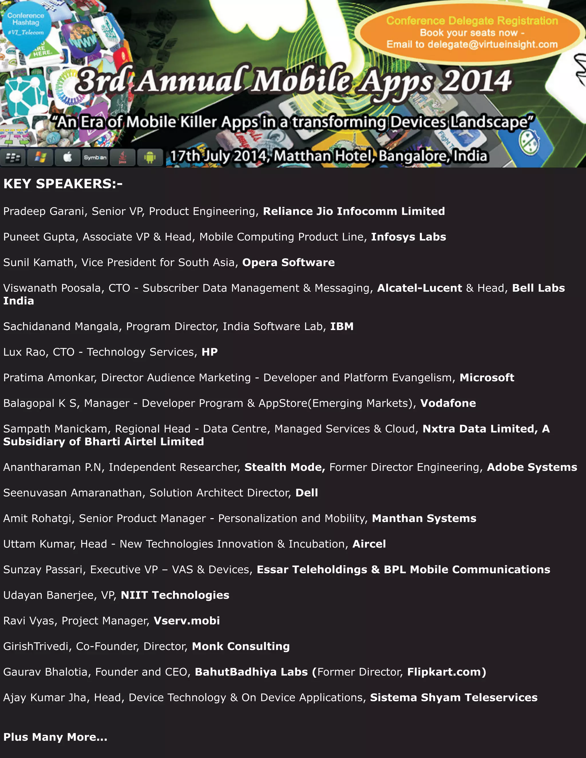 This document provides details of a conference on mobile apps held in Bangalore, India on July 17th, 2014. It lists the key speakers from companies like Reliance Jio, Infosys Labs, Opera Software, Alcatel-Lucent and more. The document outlines the conference themes around mobile ecosystem competitiveness, user experience across devices, telco response to market changes, challenges for developers, mobile payments and innovations shaping the future mobile landscape. It includes the agenda, exhibitors, attendees and provides an overview of the event.