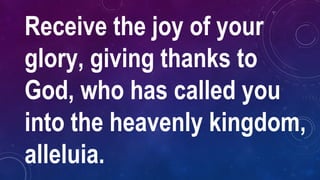 This document contains the text for a Catholic mass. It includes opening prayers and responses, readings from scripture, prayers of the faithful, preparation of gifts, Eucharistic prayer, communion rite, and closing. The mass celebrates the resurrection of Jesus Christ and brings the faithful together in worship, prayer, and receiving the Eucharist.