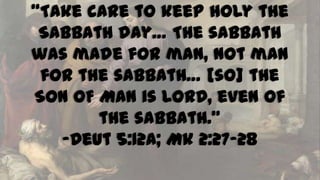 The document explains the significance of the Sabbath and its evolution into the Lord's Day for Christians, emphasizing a weekly day of rest and worship rooted in scripture and tradition. It outlines the obligations of the faithful to attend mass on Sundays and holy days, as well as the importance of communal worship within a parish. Additionally, it addresses the need for rest, leisure, and charitable works on this day, promoting a balanced rhythm of work and spiritual life.