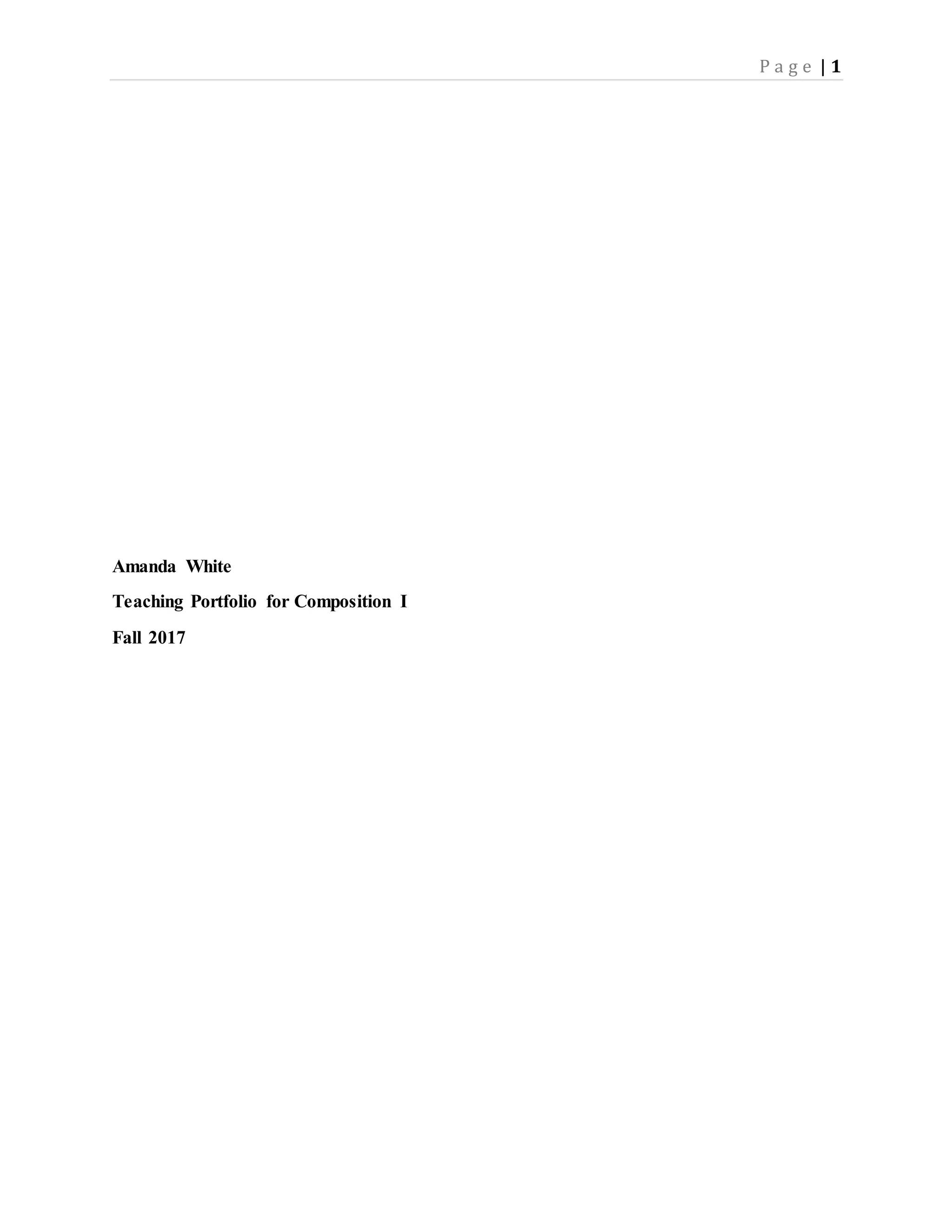 This document is Amanda White's teaching portfolio for her Composition I course. It includes 4 sections: a statement of a common writing concern among her students regarding organization, an account of a successful in-class activity addressing that concern, an account of a troubling situation with a student disputing a grade, and her teaching philosophy statement. Her experiences teaching helped shape her philosophy of using practical, collaborative classroom activities to help students learn and practice composition skills.