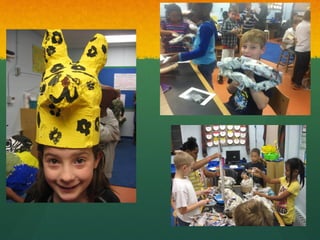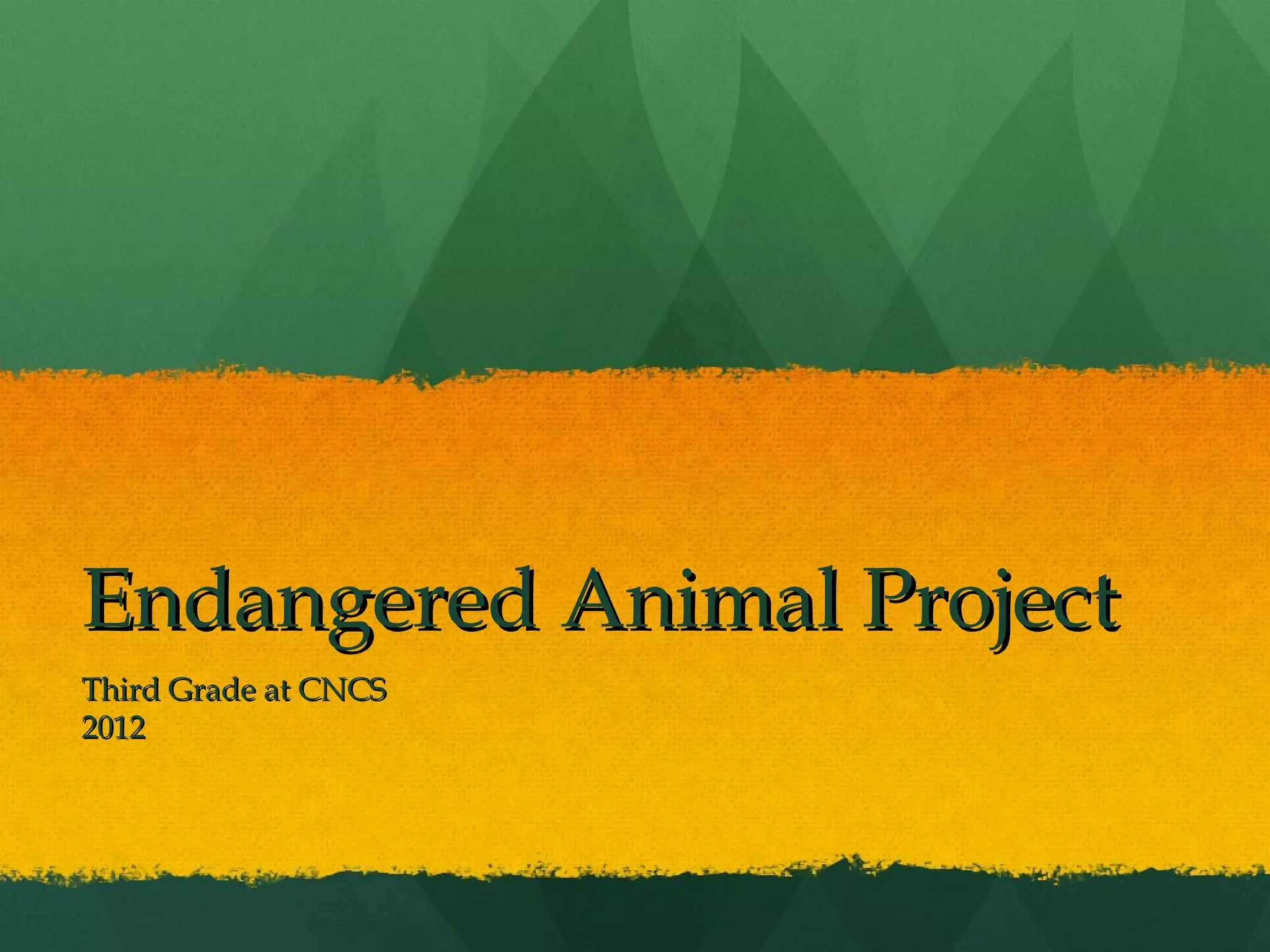 Third grade students chose to study endangered animals. Each student researched one critically endangered, threatened, or endangered animal, learning about its physical appearance, habitat, and other experts involved in its conservation like poachers, researchers, and photographers. Students created dioramas of animal habitats and puppets of their animals. After learning they could help by adopting animals, the class raised money through bake sales and crafts to adopt three emperor penguin chicks through the World Wildlife Fund.