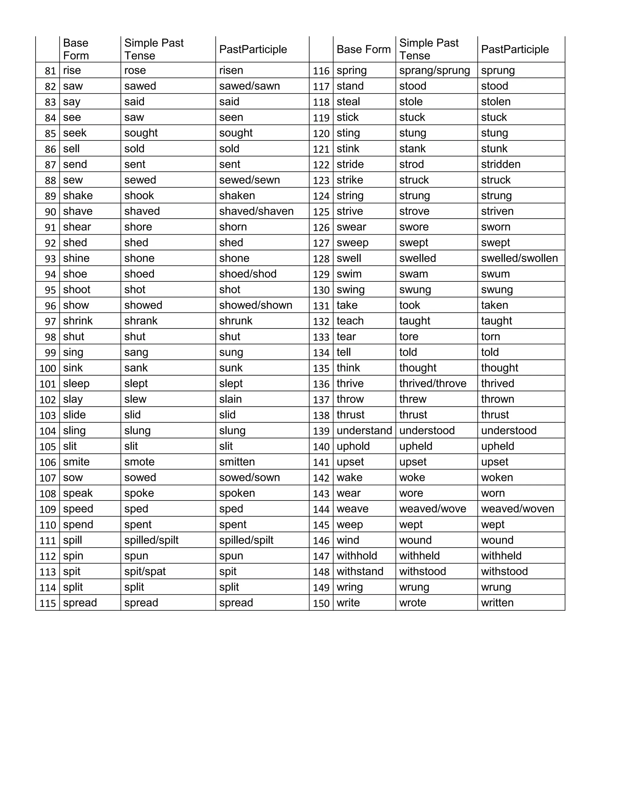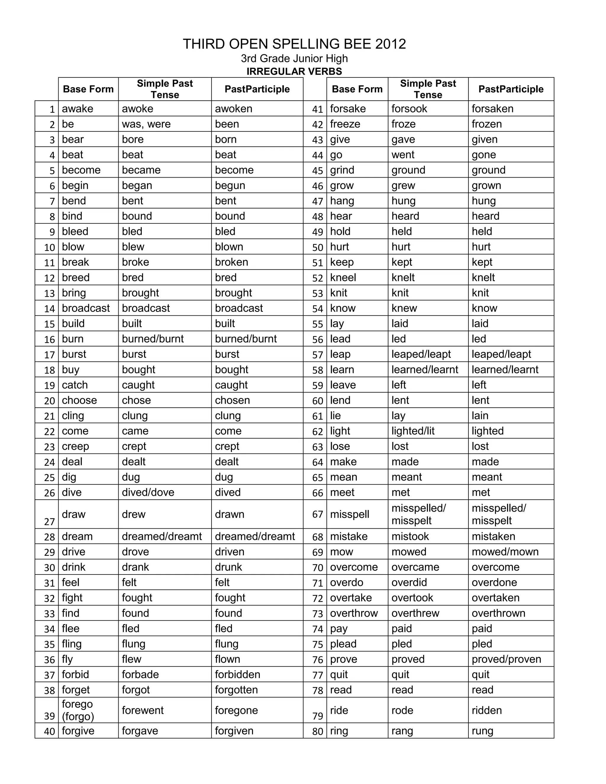 The document lists 150 irregular and regular verbs divided into their base form, simple past tense, and past participle forms. Irregular verbs are listed first with their forms in 3 columns, while regular verbs are listed afterwards with only their base forms. This appears to be content for a spelling bee focusing on verbs for 3rd grade students.