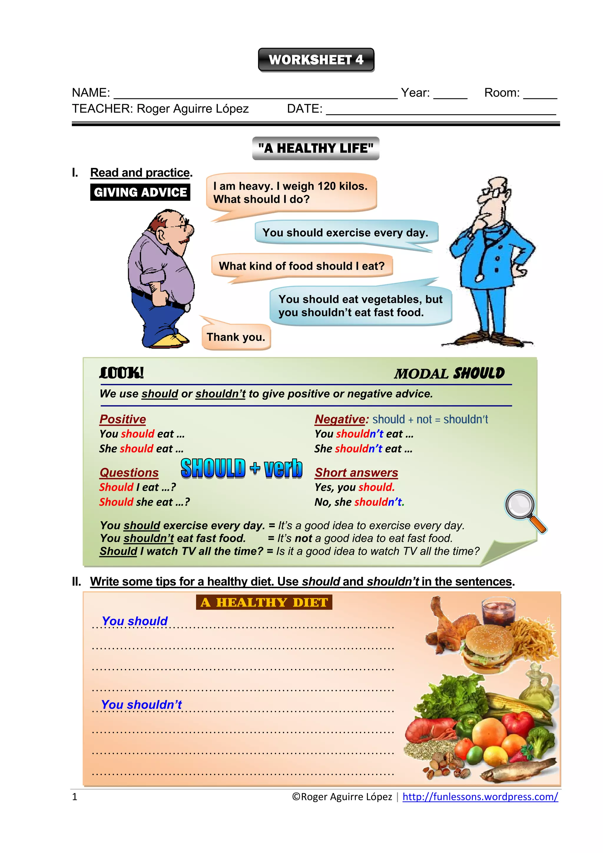 - The worksheet gives examples of using "should" and "shouldn't" to give positive and negative advice about health behaviors.