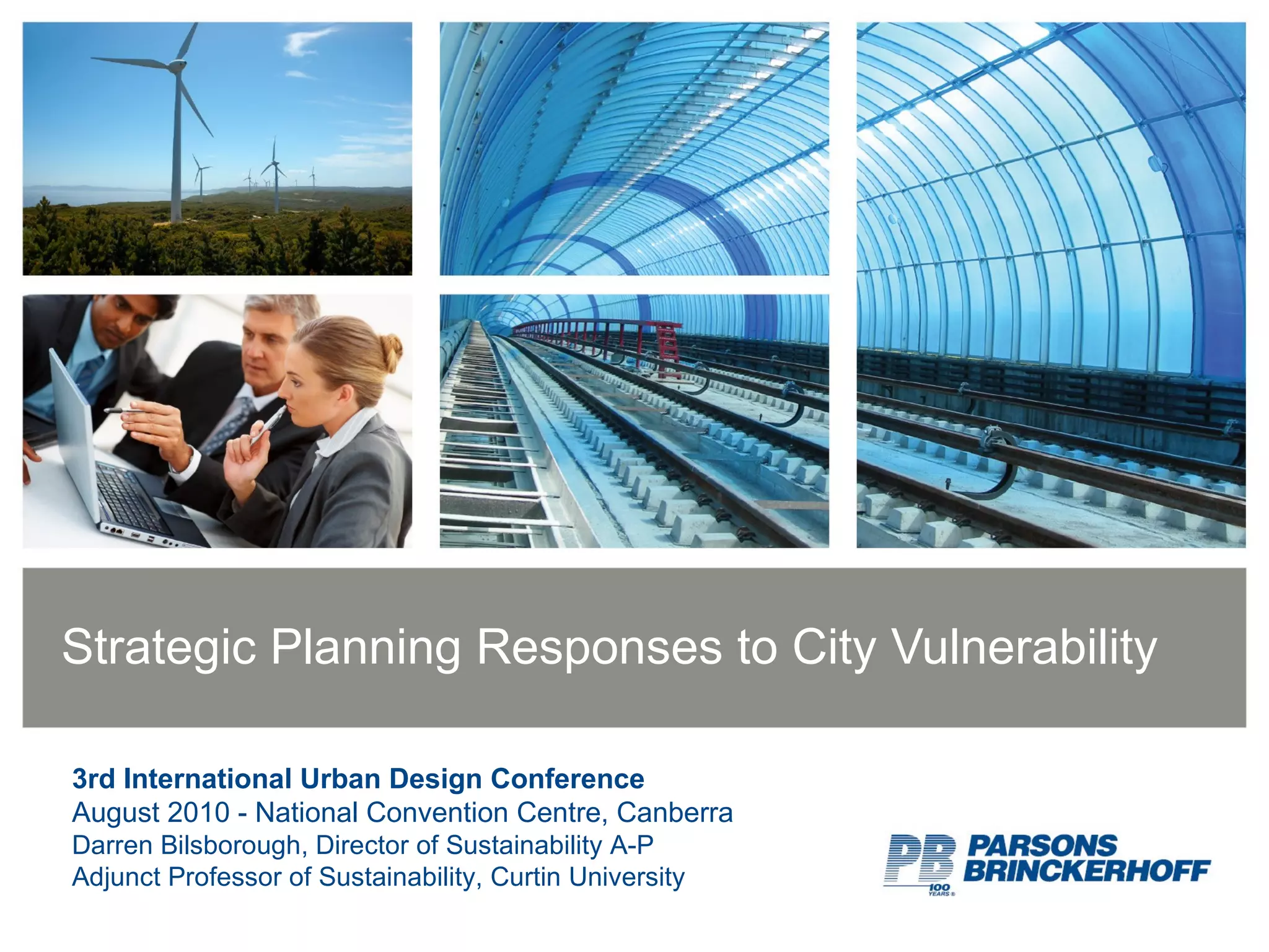 The document discusses strategic planning responses needed to address issues of city vulnerability, including climate change, resource depletion, and health impacts. It argues for a change in direction towards more sustainable approaches, including sustainable energy, urban form, land use, transport, and the biophilic city concept. Specifically, it advocates for fewer cars and more public transport, pedestrian and cycling priorities, as well as urban farming and local food supply to create biophilic cities.