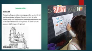 - This document summarizes a classroom experience focusing on developing English oral skills in young learners. It describes using routines, the target language of English, affective activities, and translanguaging. Activities covered family, houses, questions and a final project. The importance of repetition and using gestures to aid comprehension is highlighted. Routines helped create a comfortable atmosphere for students to freely practice their oral English skills.