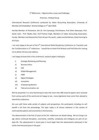 This document contains the keynote address delivered by R.Kannan of Hinduja Group at the 4th International Multi-Disciplinary Conference on Transition and Transformation in the 3rd Millennium. Some key points: