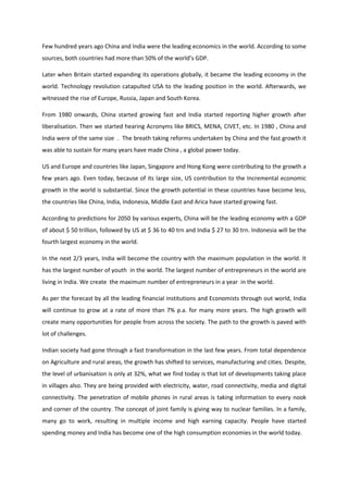 - India is poised to become the most populous country with the largest youth population and number of entrepreneurs. It is forecast to grow over 7% annually, bringing opportunities but also challenges.