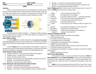 This document serves as an educational module on climate, encompassing the differences between weather and climate, elements that influence climate, and factors leading to climate change. It covers concepts such as atmospheric temperature, pressure, and ocean currents, and describes human activities that impact climate, such as fossil fuel combustion and deforestation. Additionally, it discusses the greenhouse effect, global warming, and the carbon cycle, emphasizing the consequences of increased greenhouse gas emissions.