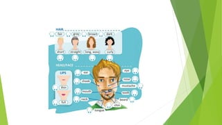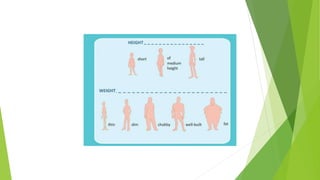 This document contains sample questions and responses about daily routines, activities, weather, clothing, and other topics related to describing oneself and one's habits. It provides sample responses to questions using simple present tense, present progressive tense, and other grammatical structures. The responses give brief details about common daily activities like going to school, having meals, spending time with family, and hobbies.