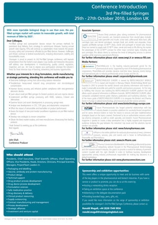 This document provides information about an upcoming conference on pre-filled syringes. It outlines the conference details including dates, location, key speakers from companies like Merck Serono and AstraZeneca. It also lists media partners, sponsors, and exhibitors. The document discusses the growing market for pre-filled syringes and challenges in the industry. It promotes the conference as a chance to learn about new developments, network, and address issues like drug compatibility and manufacturing processes. A pre-conference workshop on legal issues is also advertised.