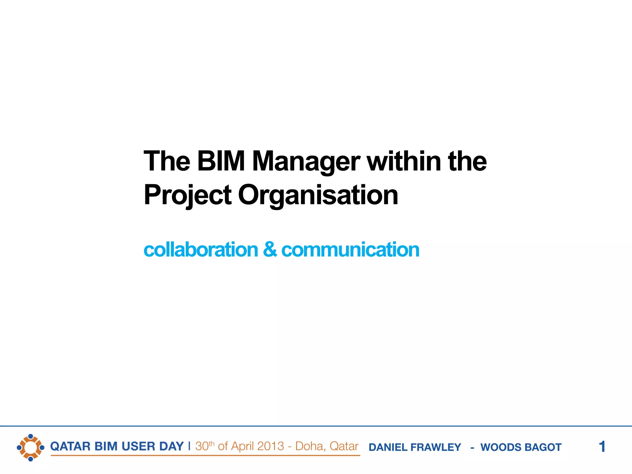 Daniel Frawley's presentation outlines the role and responsibilities of a BIM Manager within a project organization, emphasizing the blend of technical expertise and collaborative skills required for effective construction management. It highlights the need for strong communication, workflow coordination, and the use of industry standards for successful BIM implementation. Frawley stresses the importance of understanding owner deliverables and integrating project data to enhance profitability and operational efficiency.