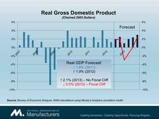 The Manufacturing Economic Update forecasts a recession in 2013, with negative GDP growth and an unemployment rate exceeding 9%. Additionally, over 1 million private sector jobs, including 130,000 in manufacturing, are expected to be lost by 2014 due to defense spending cuts. Challenges for manufacturing businesses include uncertainties over the political climate, rising costs, and a weaker domestic economy.