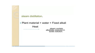 3) The document provides methods for isolating morphine from opium and atropine from belladonna, and discusses their biological significance - morphine as a pain reliever and atropine as an antidote and pupil dilator.