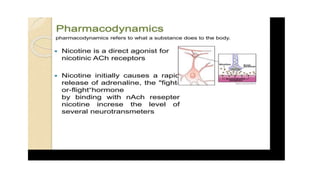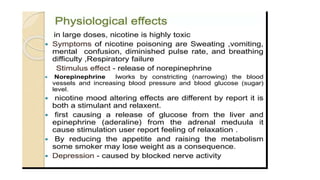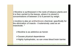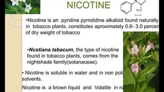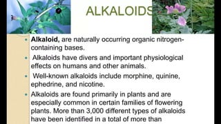 2) Morphine, nicotine, and atropine are discussed. Morphine is isolated from opium and used as a powerful narcotic for pain relief. Nicotine is the active compound in tobacco. Atropine is isolated from belladonna.
