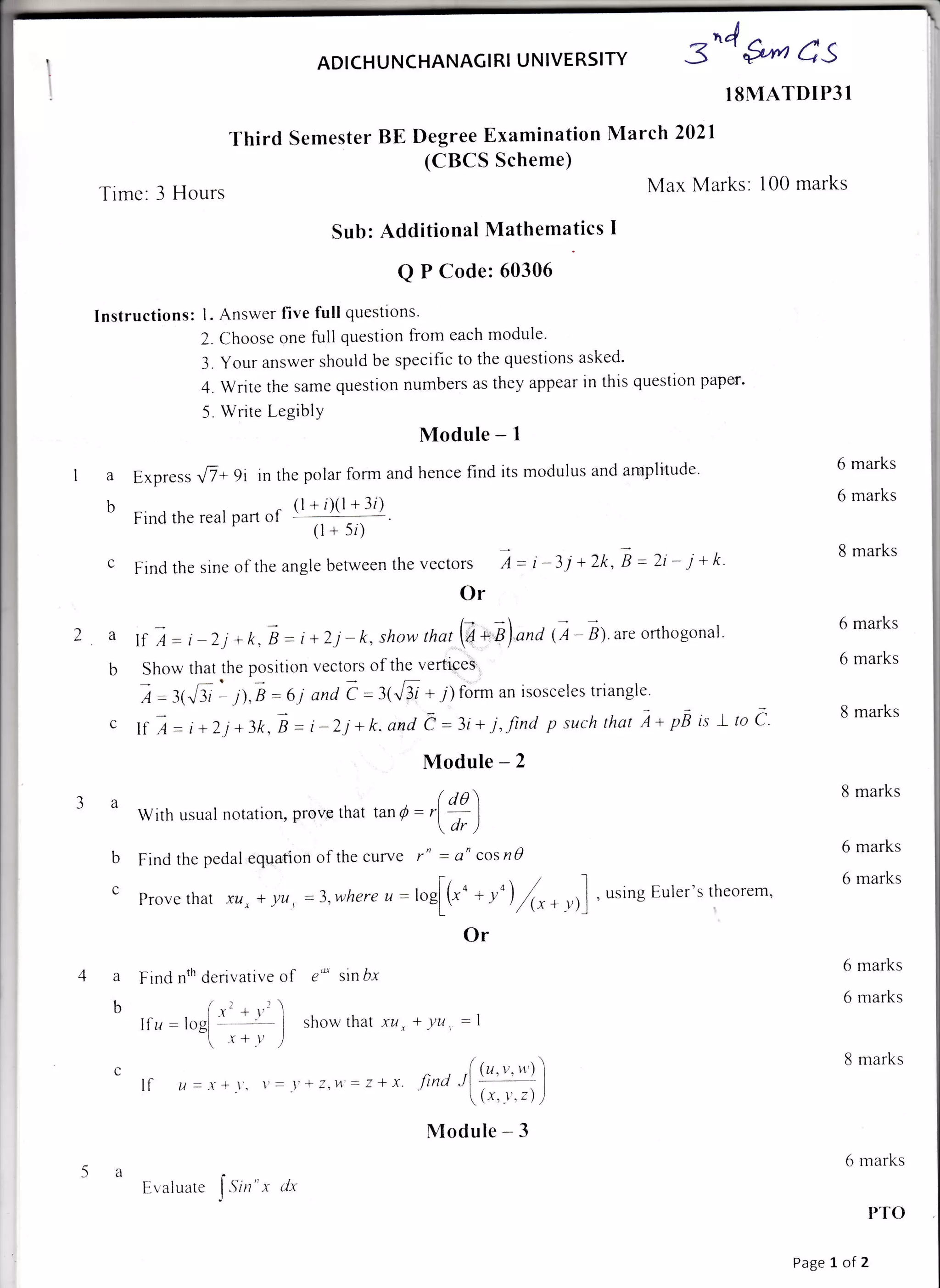 The document outlines the instructions and examination details for the Additional Mathematics I course at Adichunchanagiri University, including topics such as polar forms, trigonometric identities, and vector analysis. It specifies the structure of the examination comprising various modules and emphasizes the requirement for students to answer specific questions from each module. Additionally, students are instructed to write legibly and follow the numbering system as presented in the question paper.