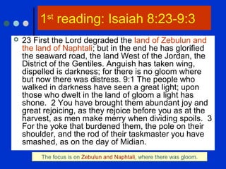 The document provides commentary and analysis for the Sunday liturgy readings. It summarizes the first reading from Isaiah which describes how the lands of Zebulun and Naphtali went from gloom to being glorified by God. It then summarizes the responsorial Psalm about having the Lord as one's light and salvation. The second reading summary explains that Paul urges the Corinthians to unity and not divisions, as some were saying they belonged to particular leaders instead of Christ alone.