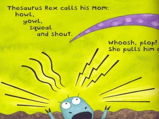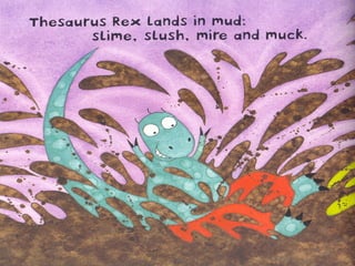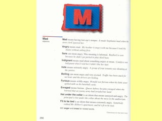 The document discusses how using synonyms can make writing more interesting by avoiding repetition. It explains that a thesaurus lists synonyms that have similar meanings to help writers find new words. The thesaurus entries are in alphabetical order and provide alternative words to substitute in sentences while keeping the same meaning. An example shows looking up the synonym for "mad" and substituting the synonym "boiling" in a sentence to vary word choice.