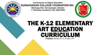 The document outlines the K-12 elementary art education curriculum, emphasizing a structured approach to developing students' understanding and appreciation of visual arts. It details content areas, instructional methods, and assessment strategies while highlighting the importance of creative expression, cultural understanding, and personal development in art education. The curriculum fosters holistic growth and encourages students to engage with both the artistic process and the evaluation of their work.