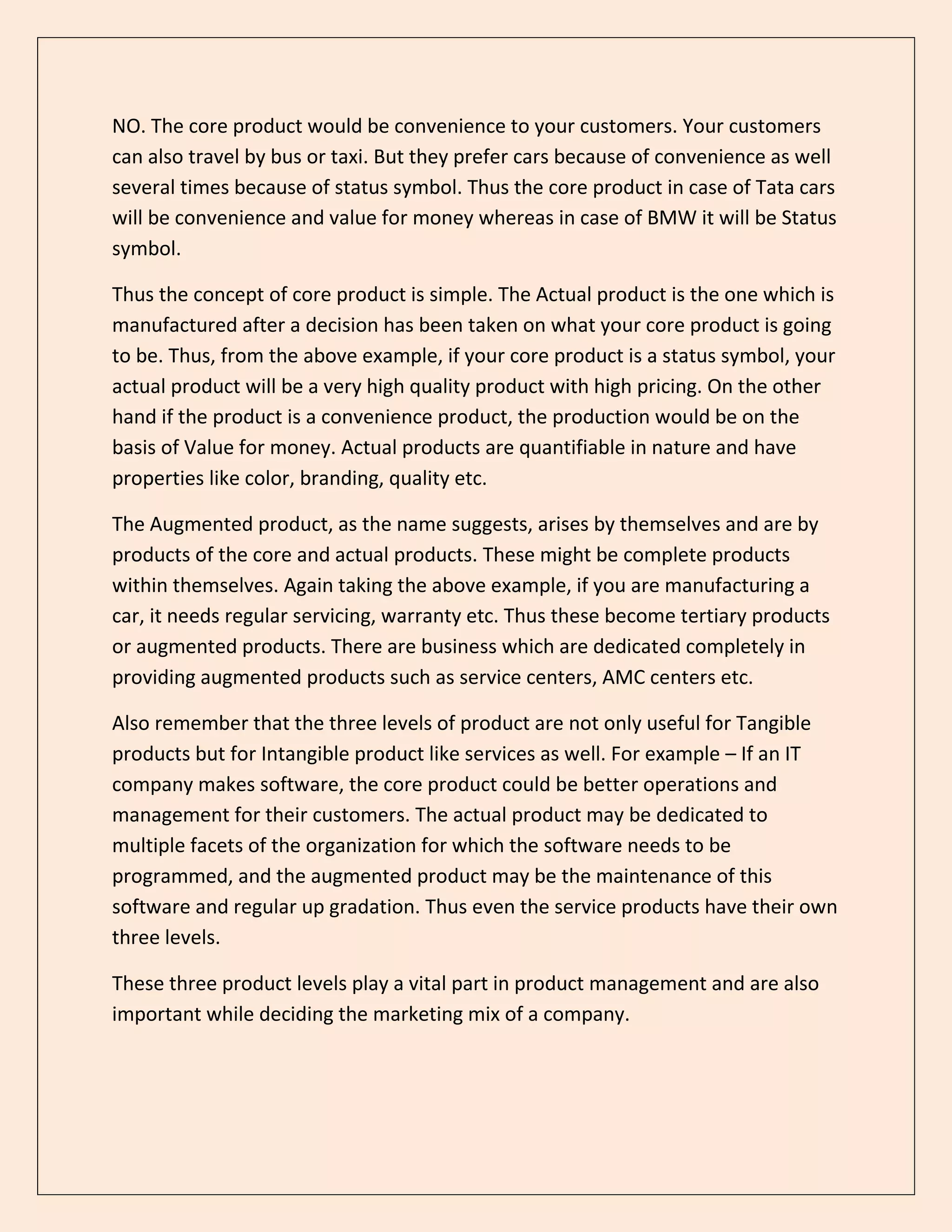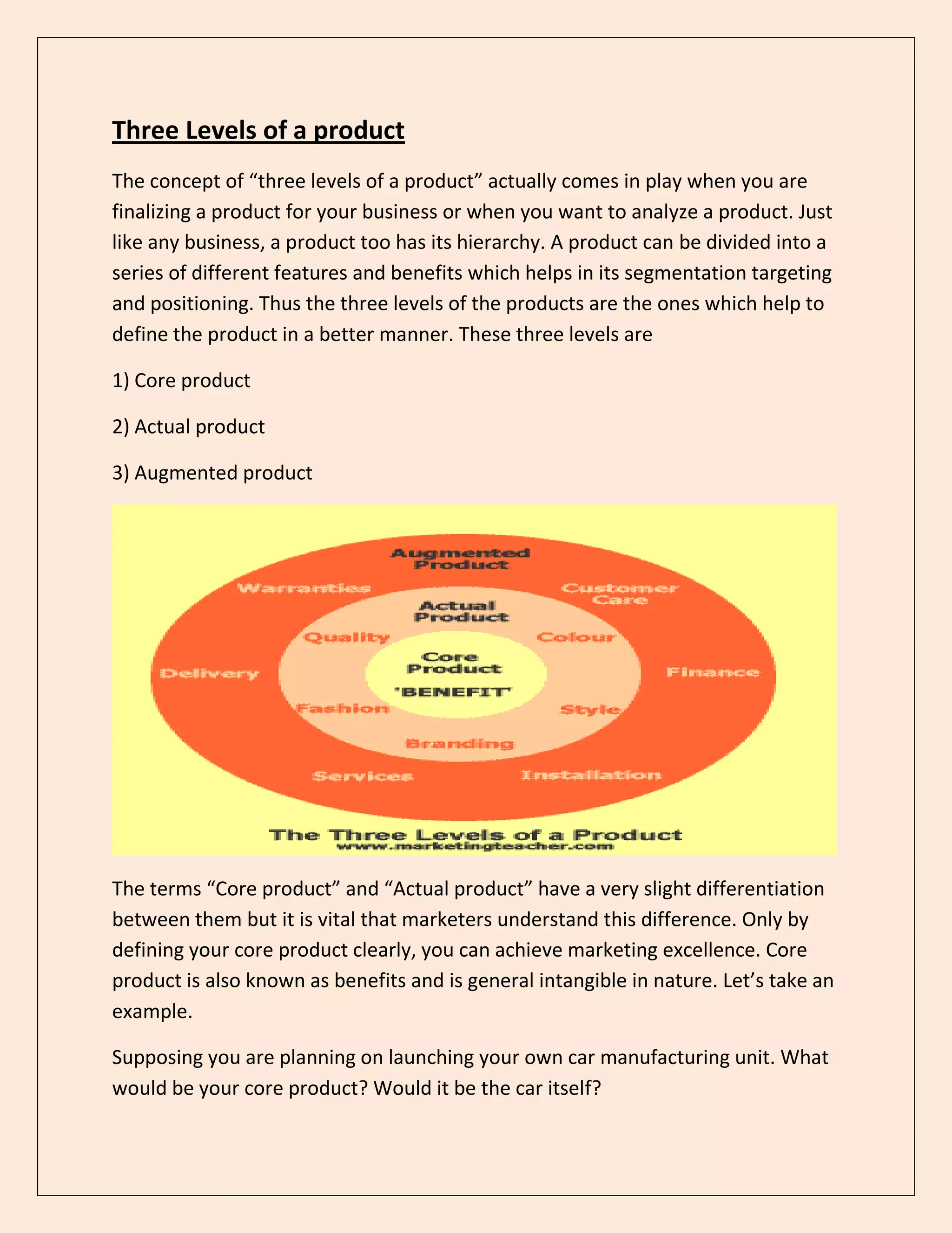This document discusses the three levels of a product: the core product, actual product, and augmented product. The core product is the intangible benefits a customer receives, such as convenience. The actual product is the tangible goods produced to deliver the core benefits. Augmented products are additional goods and services that accompany the actual product. Understanding these three levels helps with product definition, development, marketing, and pricing. The document then provides an overview of the new product development process, outlining common steps such as idea generation, concept development and testing, business analysis, commercialization, and pricing.
