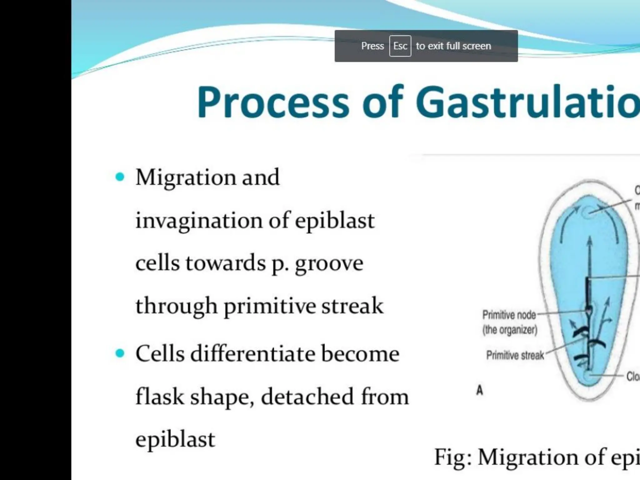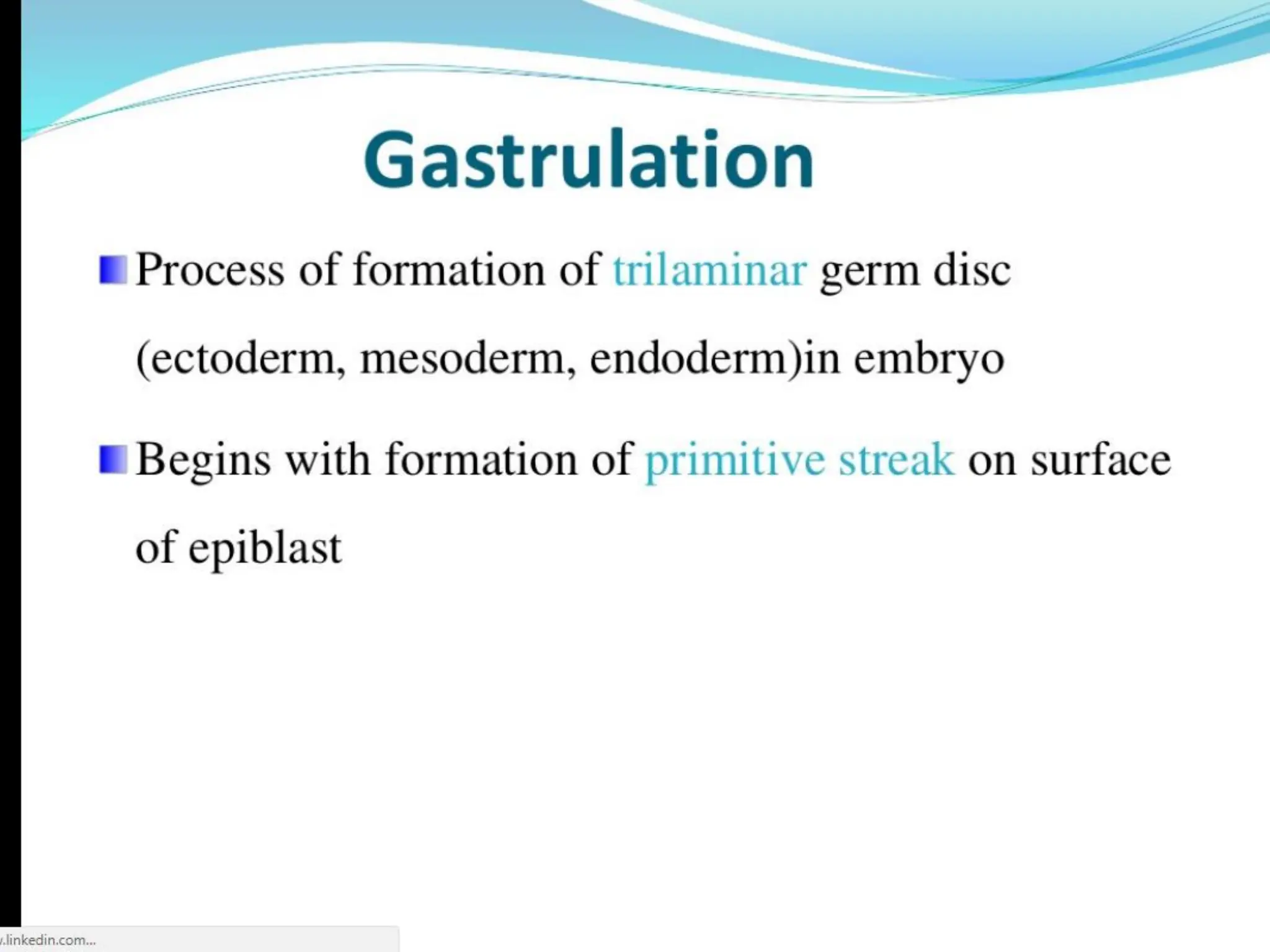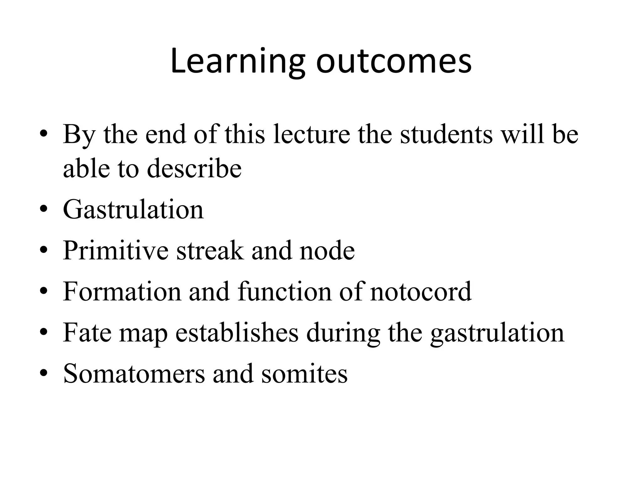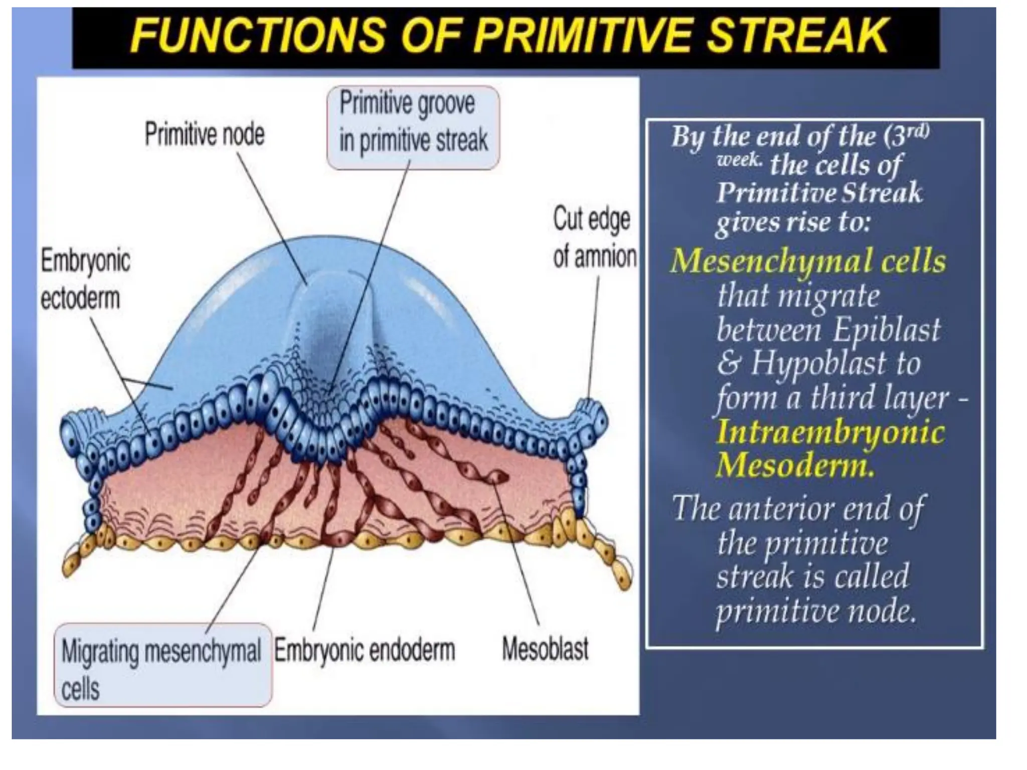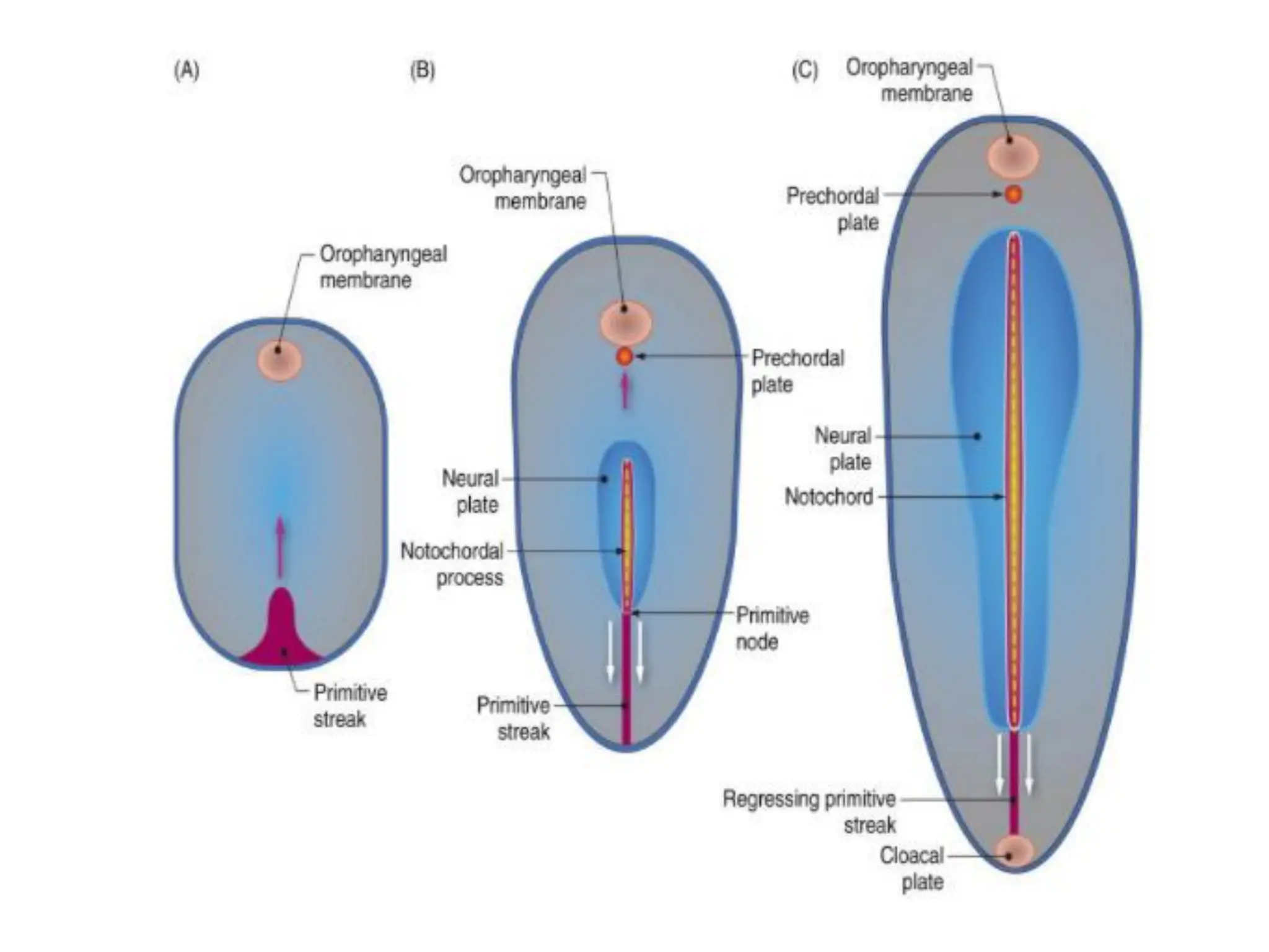 1. Gastrulation - the formation of the germ layers (ectoderm, mesoderm, endoderm) through invagination of cells through the primitive streak, controlled by FGF8.