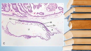 During the third week of development, the embryo undergoes gastrulation where the three germ layers (ectoderm, mesoderm, endoderm) are established. This begins with the formation of the primitive streak, which develops into the primitive node. Cells from the primitive streak migrate inward and replace the hypoblast, forming the endoderm and mesoderm. The notochord also develops during this week, forming from the primitive node and inducing the formation of the neural tube from the overlying ectoderm. The lecture objectives were to define gastrulation, discuss primitive streak development and related anomalies, and describe the development of the notochord, prechordal plate, and cloacal membrane.