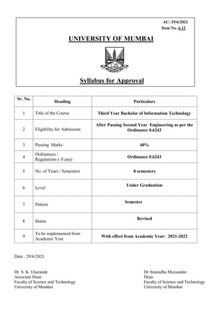 The University of Mumbai has revised its Bachelor of Engineering in Information Technology syllabus, effective from the academic year 2021-2022, focusing on outcome-based education to enhance student learning and reduce contact hours. The updated curriculum emphasizes skill-based labs and mini projects, incorporates online learning resources, and aligns with AICTE model guidelines to ensure employability and address industry needs. It includes new courses on contemporary technologies and encourages self-learning to prepare students for future challenges in the IT field.