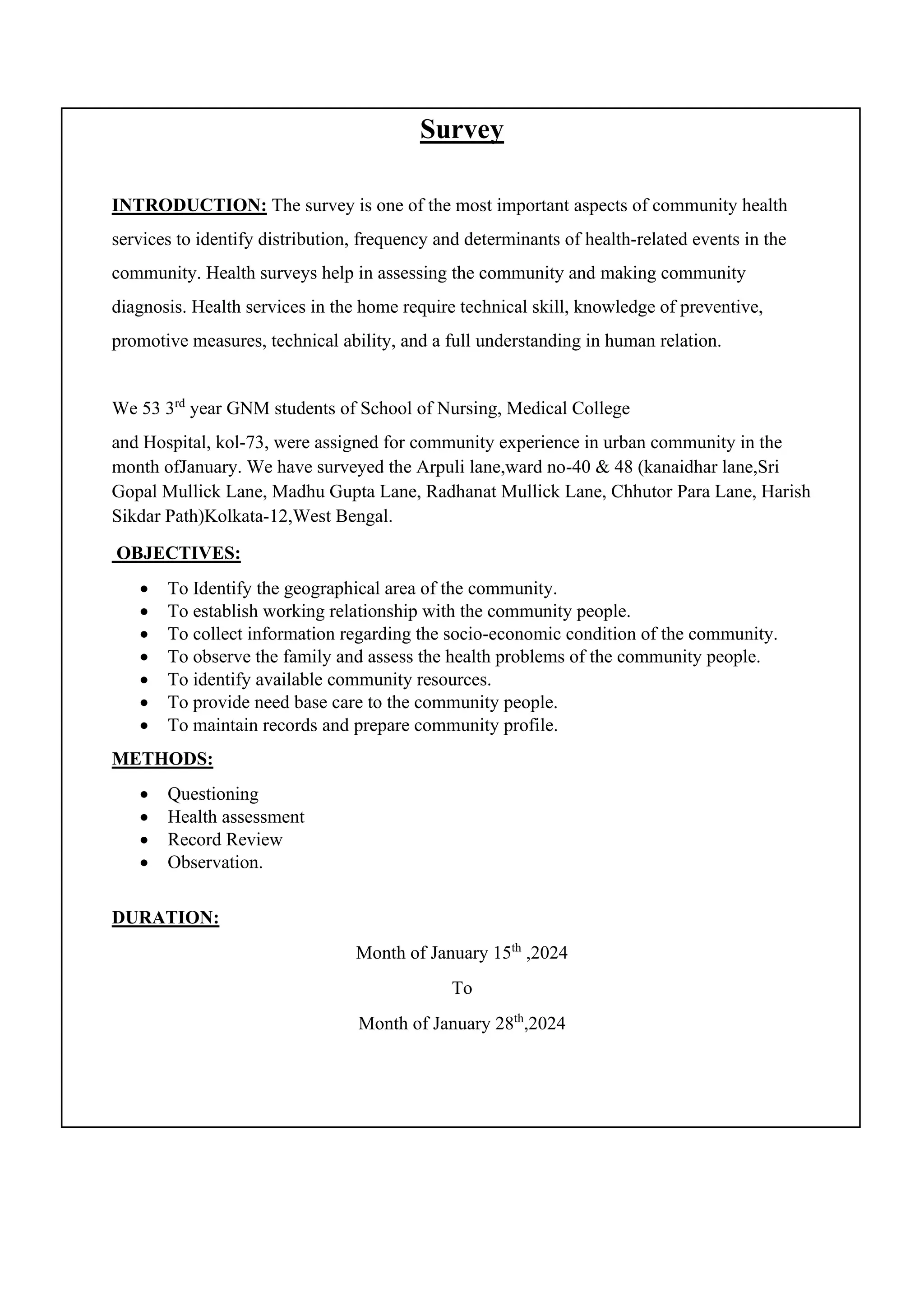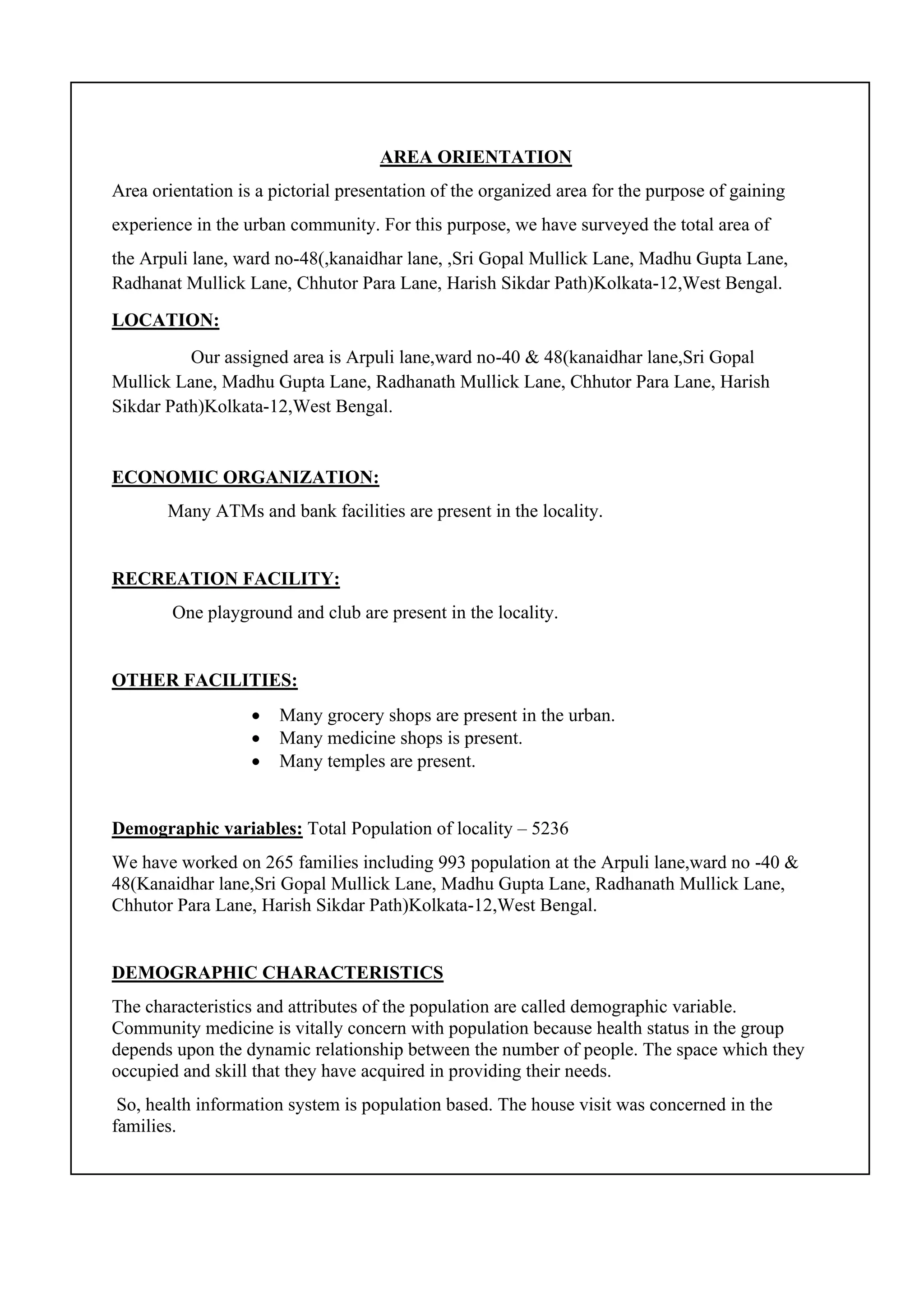 The document presents a community health survey conducted by GNM nursing students in specific urban areas of Kolkata, focusing on the socio-economic conditions and health-related needs of the local population. Key findings include demographic data, educational status, occupational distribution, economic conditions, and sanitation facilities within 265 families surveyed. The study emphasizes the importance of community health services in identifying needs and providing targeted care.