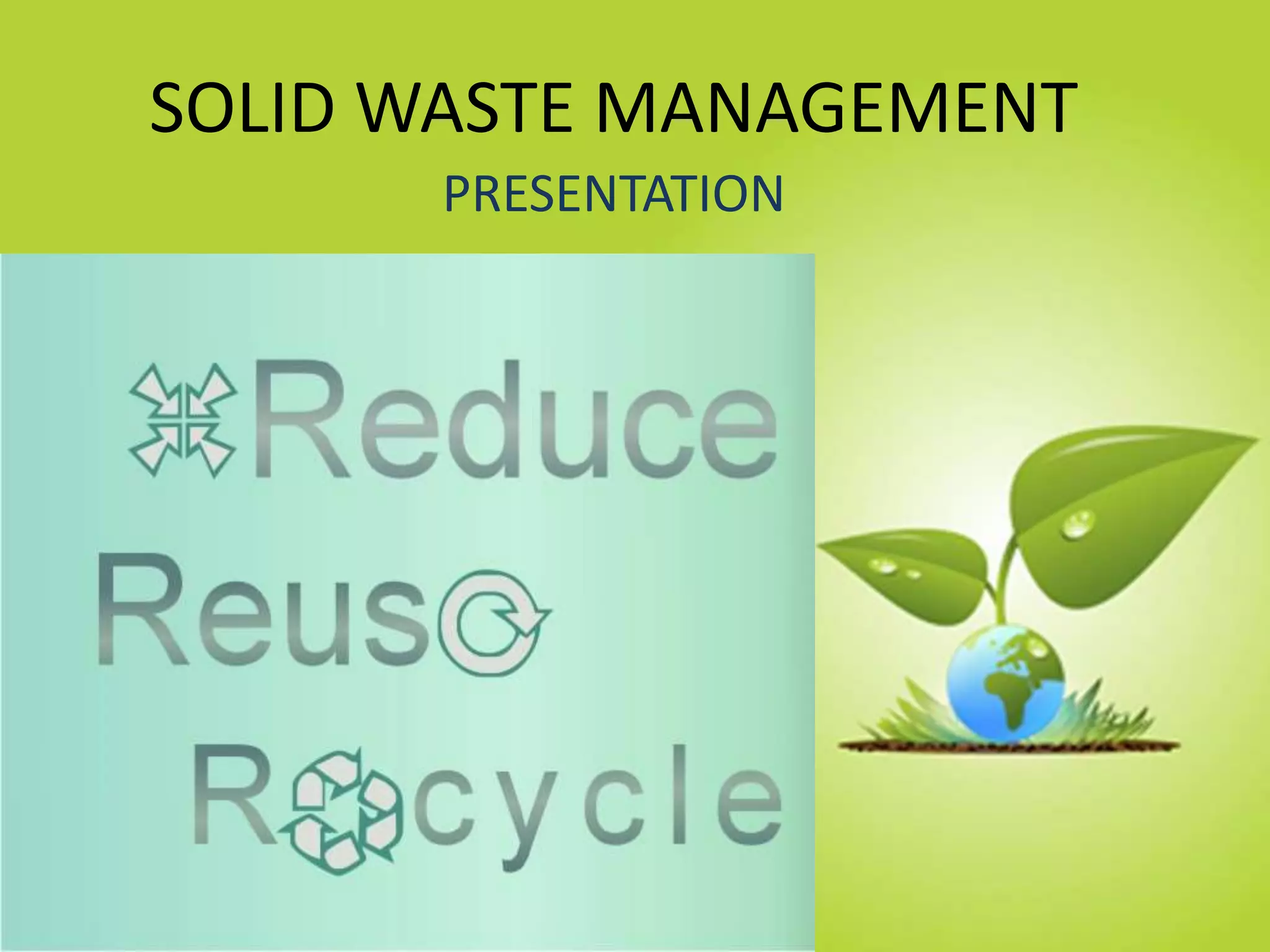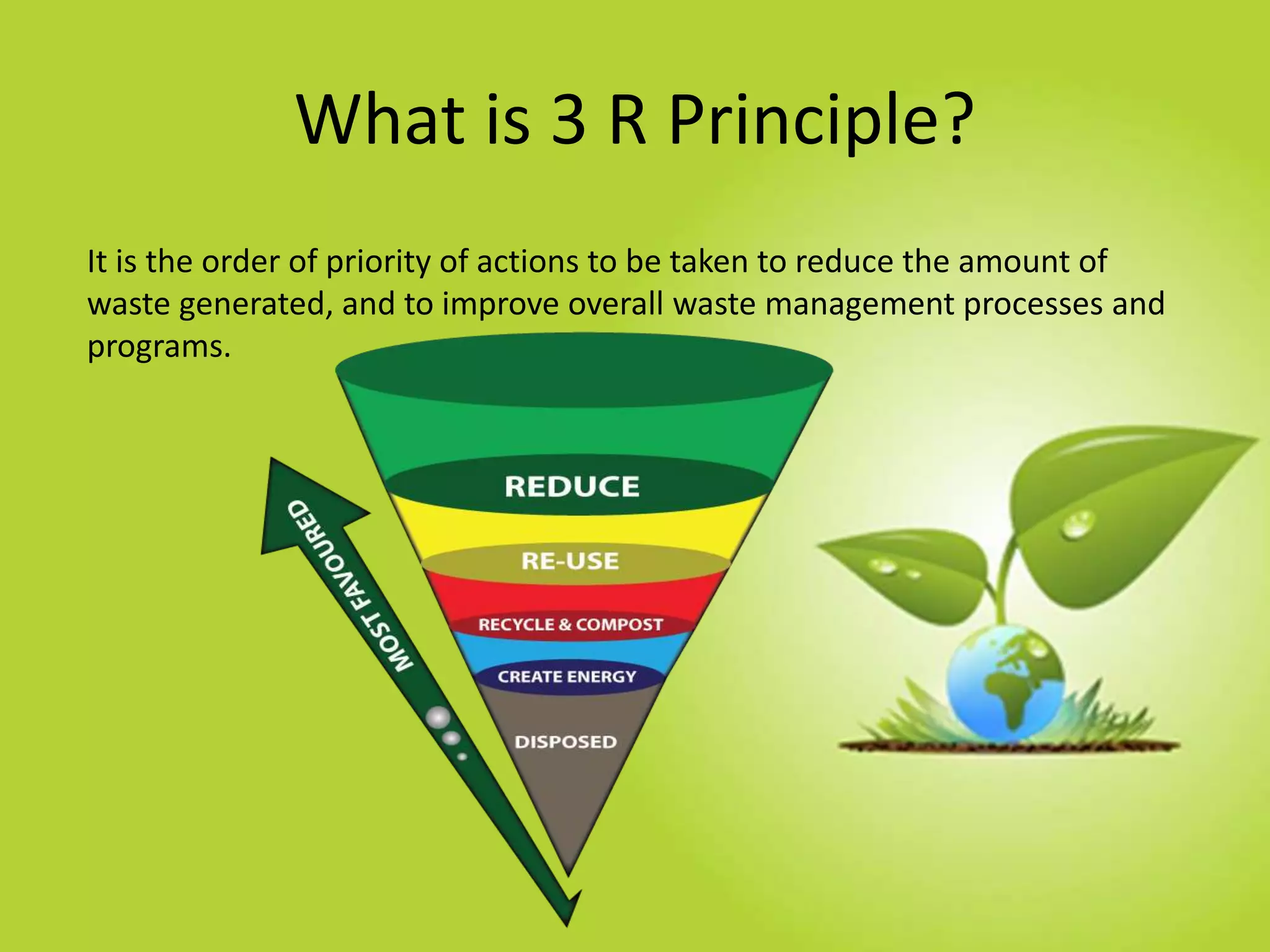 The document discusses the 3 R principles of waste management - reduce, reuse, and recycle. It defines each principle and provides examples. Reduce means not producing unnecessary waste in the first place. Reuse involves using an item again without processing, like donating or selling second-hand items. Recycling turns waste materials into new products, saving resources. The document provides tips for reducing, reusing, and lists many items that can be recycled like paper, plastic, electronics, and construction waste. It concludes that reducing waste is important to save money and resources and protect the environment.
