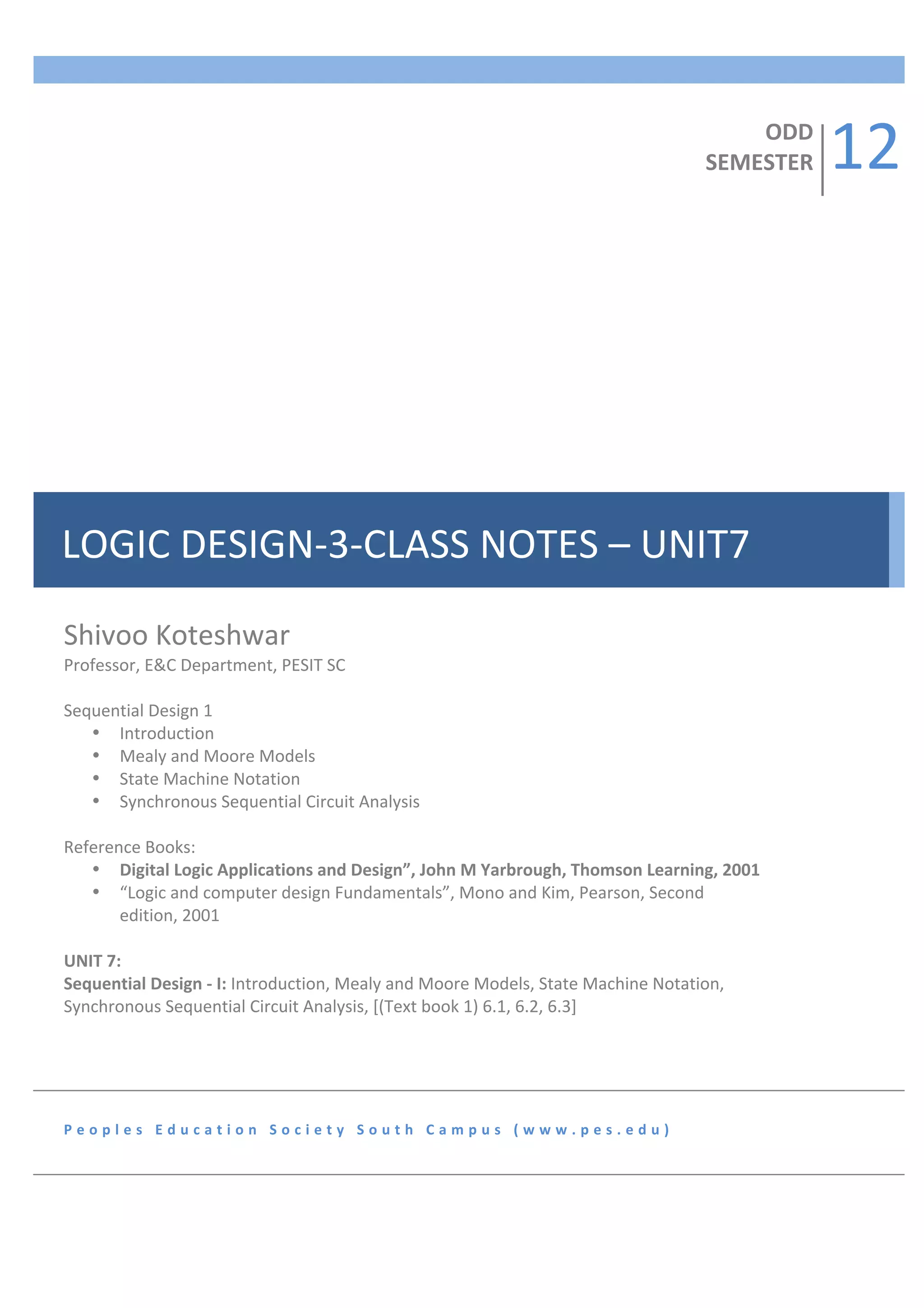 The document discusses sequential circuit design and state machines. It introduces synchronous sequential circuits and covers the Mealy and Moore models. The key differences between the Mealy and Moore models are described. State machine notation is defined, including state variables, input variables, output variables, and excitation variables. The document provides steps for implementing a state diagram using J-K flip-flops, including understanding the state diagram, writing the state table, encoding states, selecting flip-flops, deriving the excitation table, and creating the schematic diagram.
