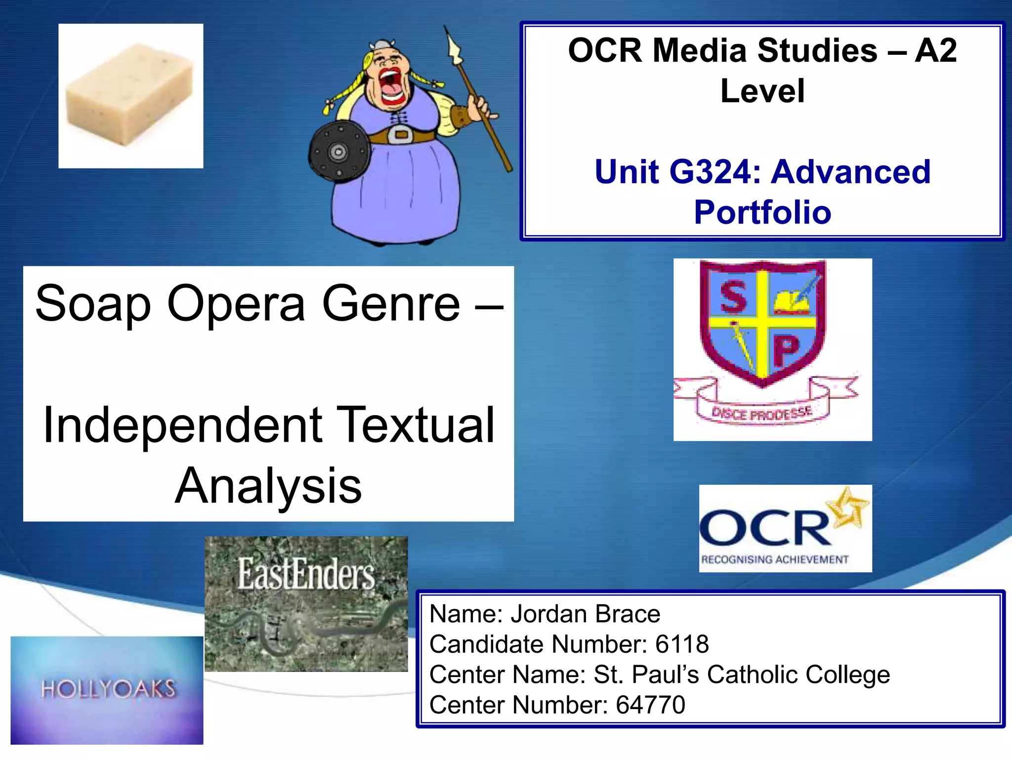This document provides an analysis of two soap opera trailers: Hollyoaks and EastEnders. For Hollyoaks, the trailer uses dialogue with cliffhangers, diegetic sound, and fast-paced music to create tension and intrigue. It features multiple settings and characters shown in mostly negative lights. EastEnders' trailer contains no dialogue or effects, relying solely on a dark, ominous song and freeze frames of characters with suspicious facial expressions across varied settings under low lighting. Both aim to entice viewers by depicting drama and mysteries without fully revealing details, leaving audiences wanting more information through continued viewing.