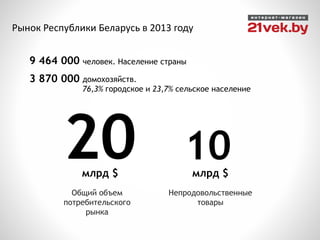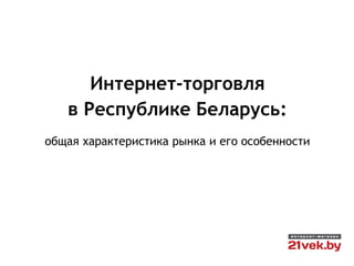 Документ представляет собой анализ интернет-торговли в Беларуси, описывающий его рост с 2005 года и текущее состояние рынка. В 2013 году уровень проникновения интернета достиг 54%, что способствовало увеличению числа интернет-магазинов и онлайн-покупок. Документ также подчеркивает влияние серого рынка и контрабанды на торговлю, а также законодательные и экономические факторы, влияющие на сектор.