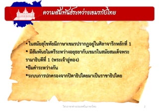 มีสัมพันธไมตรีระหว่างอยุธยากับเขมรในสมัยสมเด็จพระ รามาธิบดีที่ 1 (พระเจ้าอู่ทอง) •ยืมคําระหว่างกัน •ระบบการปกครองจากปิตาธิปไตยมาเป็นราชาธิปไตย 2วิชาภาษาต่างประเทศในภาษาไทย