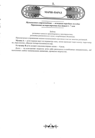 This document provides a concise 3-part exercise routine set to music that involves full body movement and coordination. The routine begins with marching movements of the arms and legs. It then incorporates torso rotations and reaching movements of the arms in different directions. Finally, it includes hopping movements and a gentle spin. The routine aims to develop physical skills while allowing self-expression through creative dance.