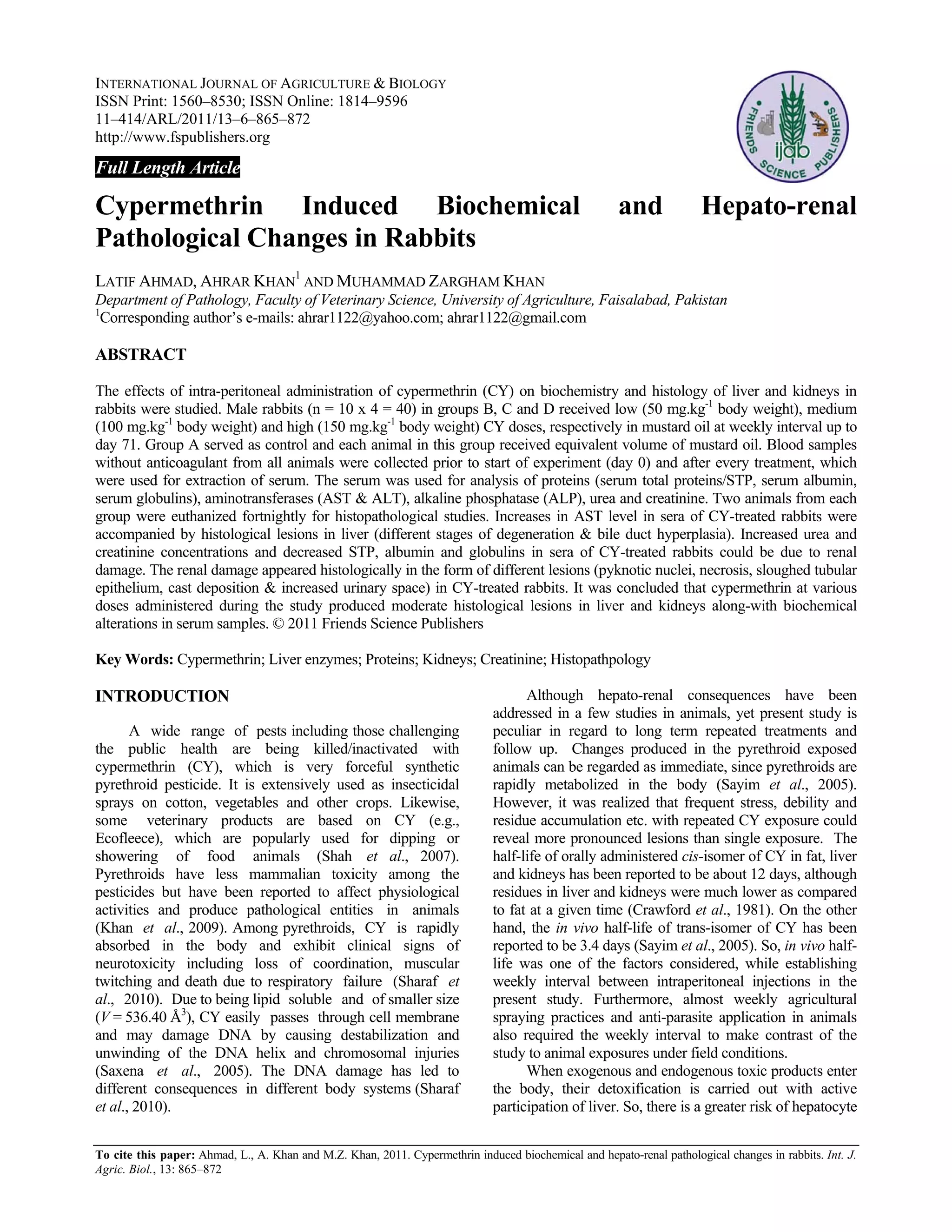 The document summarizes a study on the effects of cypermethrin pesticide on rabbit biochemistry and liver/kidney histology. Rabbits received low, medium, or high doses of cypermethrin intraperitoneally over 71 days. Blood samples were analyzed for liver and kidney enzymes/proteins. Liver and kidney tissues were examined histologically. Results showed cypermethrin increased liver enzymes and urea/creatinine levels in blood in a dose-dependent manner, indicating liver and kidney damage. Histological examination found corresponding dose-dependent lesions in the liver (degeneration, bile duct hyperplasia) and kidneys (necrosis, cast deposition, increased urinary space), confirming cyper