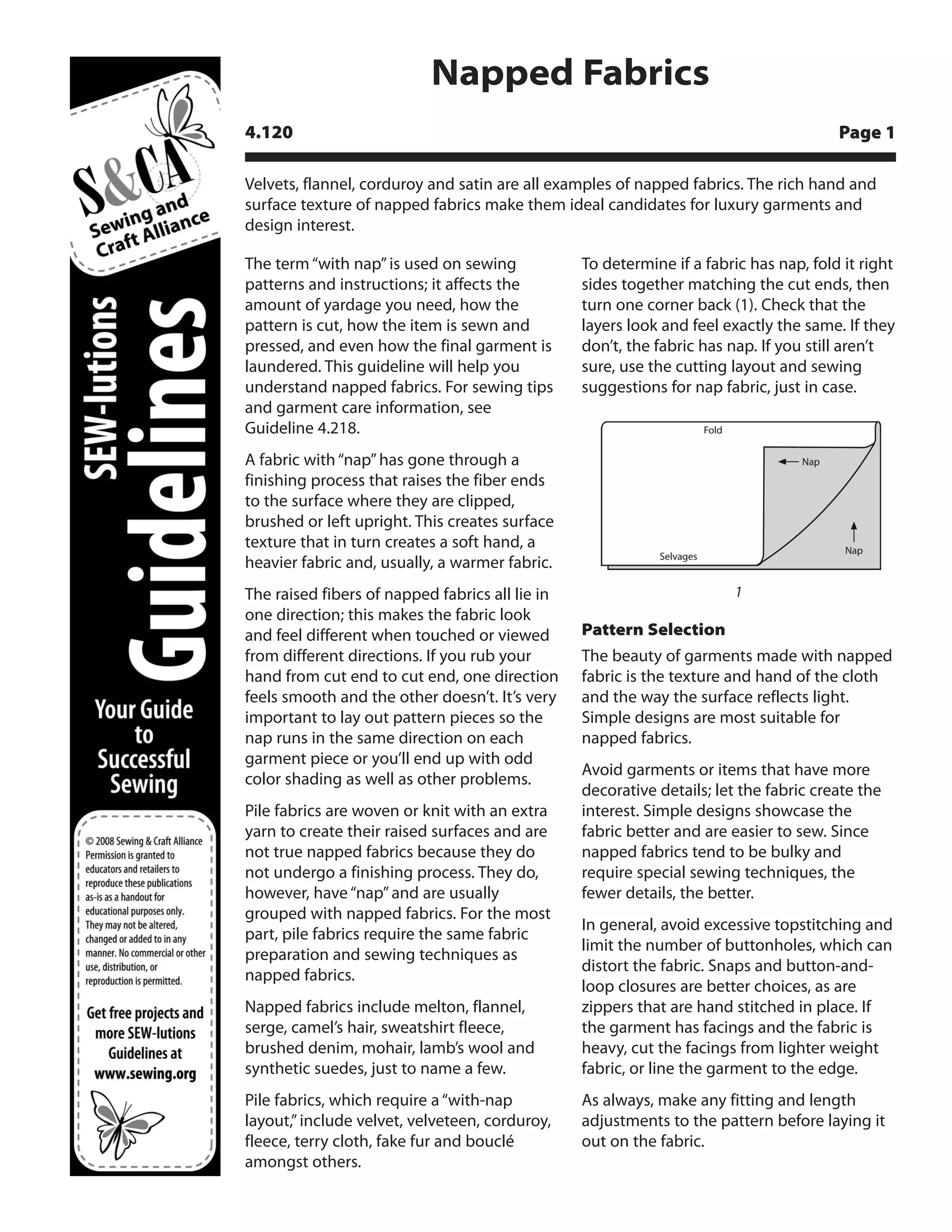 Napped fabrics such as velvet, corduroy, and fleece have raised fibers that create texture and softness. When working with these fabrics, it is important to lay out pattern pieces so that the nap runs in the same direction to avoid odd coloring and fitting issues. Simple designs that showcase the fabric are best for napped fabrics, which require special cutting and sewing techniques due to their bulkiness.