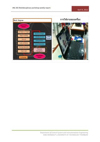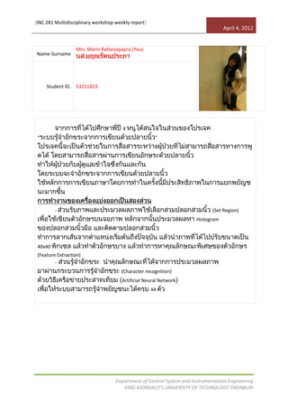 This weekly report summarizes work from a multidisciplinary workshop. It describes extracting features from 40x40 pixel images using histograms and setting the image region. Character recognition was performed using an artificial neural network to recognize 44 characters with an accuracy of 44%. The report was submitted by Mrs. Marin Rattanapapra, student ID 53211823, to the Department of Control System and Instrumentation Engineering at King Mongkut's University of Technology Thonburi.
