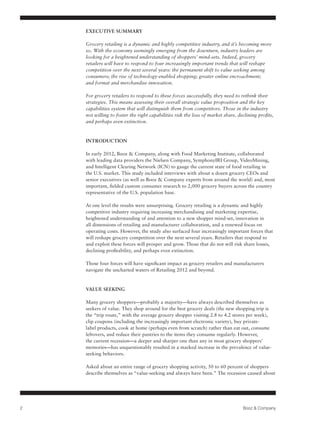This document summarizes four forces that will reshape grocery retail competition over the next several years: 1) the permanent shift to value seeking among consumers due to the recession, with about two-thirds of shoppers indicating they will maintain frugal shopping behaviors even after the economy improves; 2) the rise of technology-enabled shopping; 3) greater online encroachment; and 4) format and merchandise innovation. Grocery retailers will need to rethink their strategies and capabilities to respond successfully to these forces to prosper and grow.