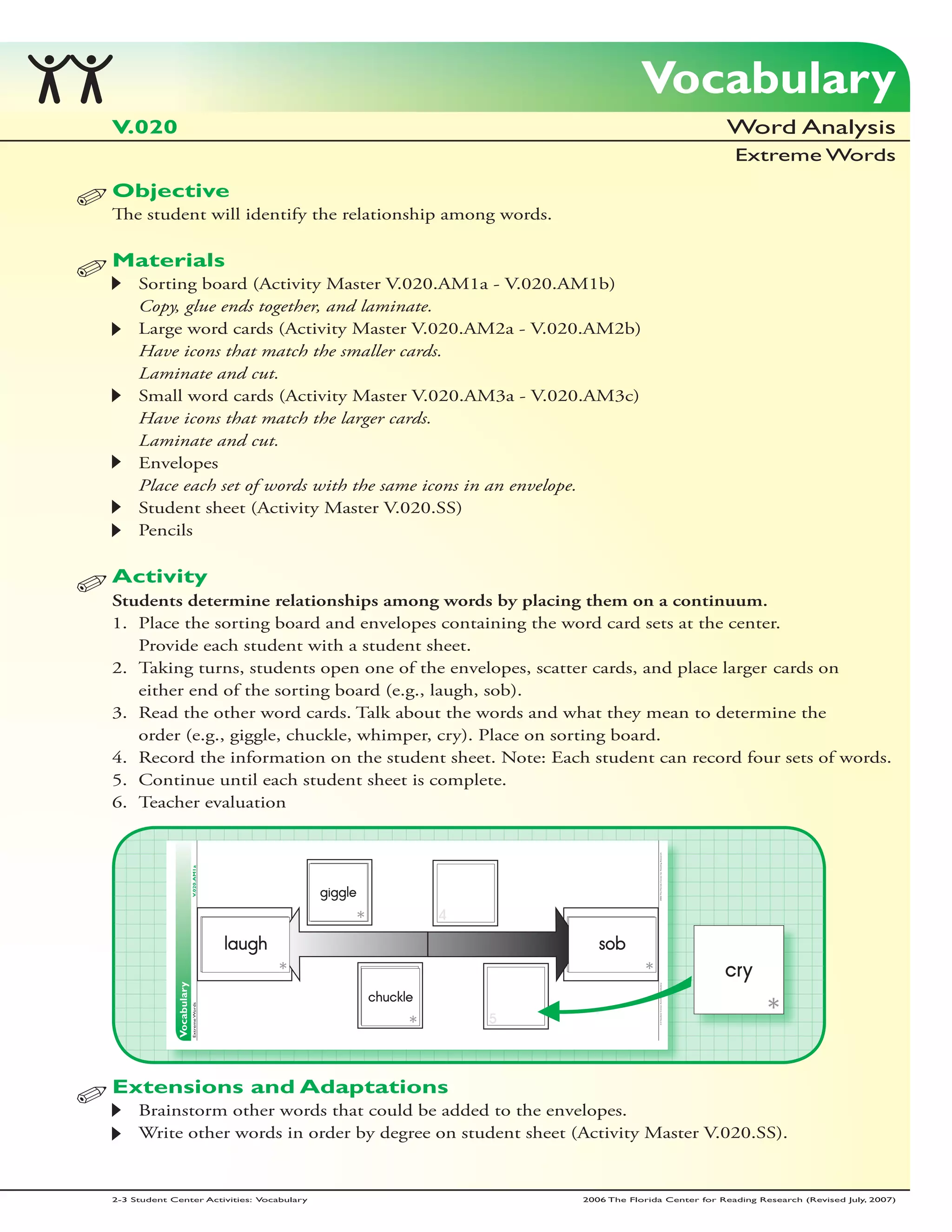 The document provides instructions for an activity where students sort word cards into categories based on relationships to identify more precise alternatives for overused words. Students work individually to place word cards under header cards with overused words like "happy" and "big" and record their matches. The teacher evaluates students' ability to identify precise word alternatives in the sorting activity.