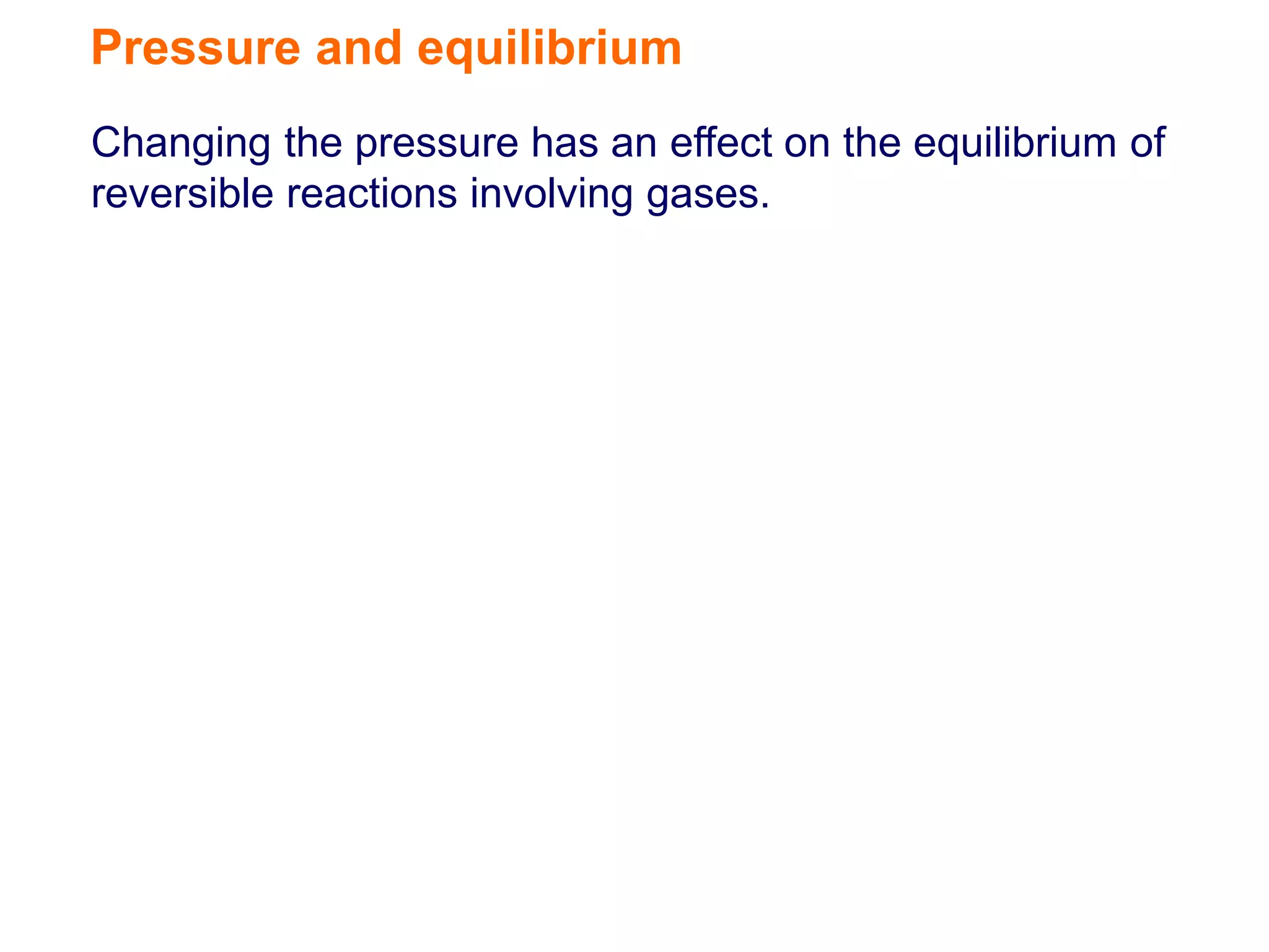 The document discusses how changing the pressure affects the equilibrium of reversible gas reactions. It states that if the pressure is increased, the equilibrium will shift in the direction that decreases the number of gas molecules. If the pressure is decreased, the equilibrium will shift in the direction that increases the number of gas molecules. It also provides the example of nitrogen dioxide and dinitrogen tetroxide, explaining that if the pressure of this system is increased, more dinitrogen tetroxide will be produced.